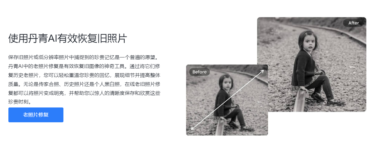 照片修復技術為我們提供了一種重現(xiàn)珍貴回憶的方式,讓那些破損、褪色的照片重現(xiàn)昔日風采。丹青AI網(wǎng)站憑借先進的技術、優(yōu)質(zhì)的服務和對用戶需求的深刻理解,成為照片修復領域的優(yōu)選平臺。無論是想修復家庭老照片,還是恢復意外損壞的數(shù)碼照片,丹青AI都能滿足您的需求,為您提供最優(yōu)質(zhì)的照片修復體驗。選擇丹青AI黑白照片修復變高清,讓您的回憶永恒閃耀!