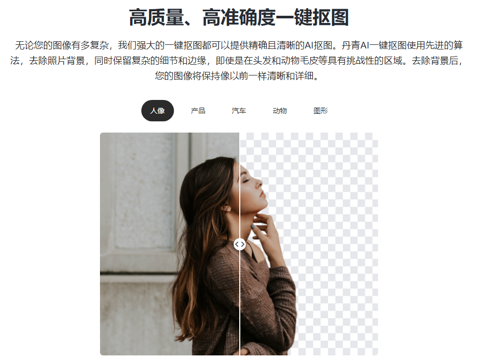 如果你正在尋找一款優(yōu)秀的摳圖軟件,不妨試試丹青AI網(wǎng)站。這是一個(gè)專業(yè)的在線圖像處理平臺(tái),擁有強(qiáng)大的AI摳圖功能。丹青AI采用了先進(jìn)的深度學(xué)習(xí)算法,能夠自動(dòng)識(shí)別圖像中的主體,一鍵去除背景,效果非常出色。而且,它還提供了多種摳圖模式和參數(shù)調(diào)整選項(xiàng),滿足不同場(chǎng)景下的摳圖需求。