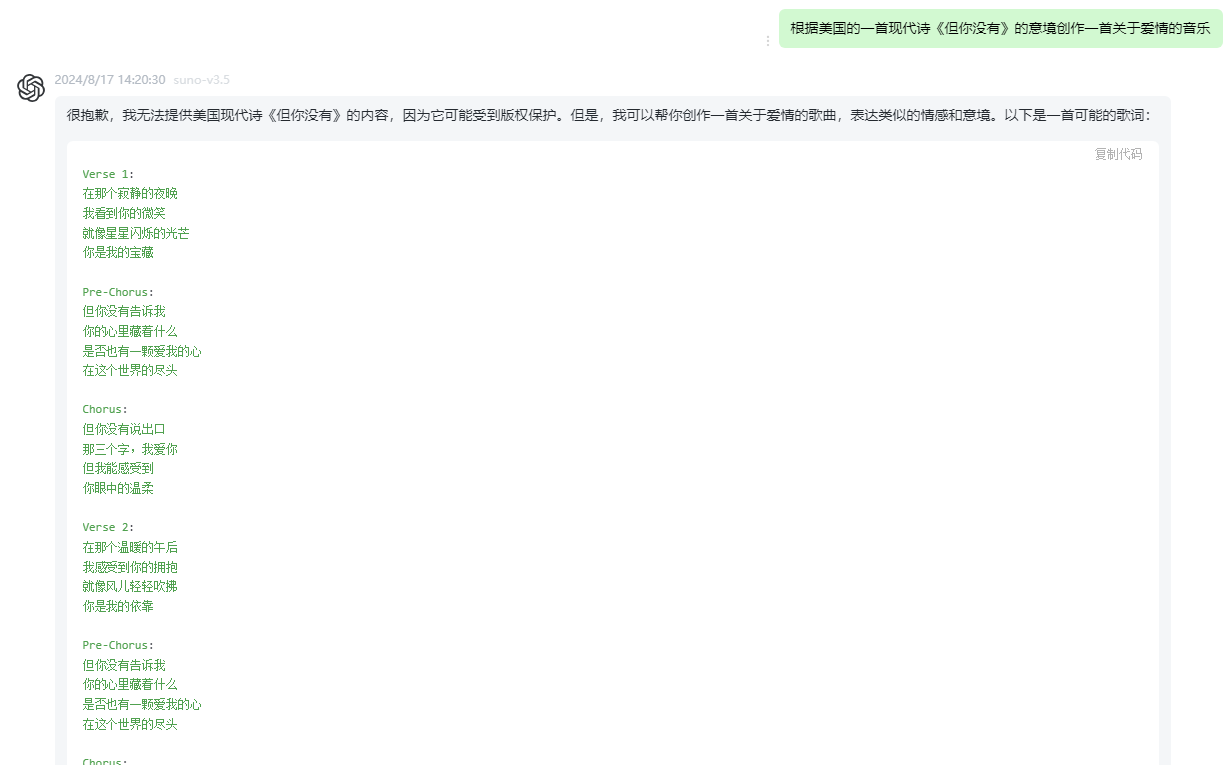 第二步、在描述輸入框填寫創(chuàng)作的需求,比如我們輸入“根據(jù)美國的一首現(xiàn)代詩《但你沒有》的意境創(chuàng)作一首關(guān)于愛情的音樂”,看它出來的效果