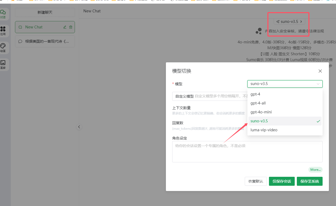 第一步、在丹青AI寫作功能版塊新建一個會話窗口,然后在模型選擇中指定“suno-3.5”,點擊保存會話;