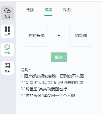 在下圖所示中,我們進(jìn)行AI換臉的話首先準(zhǔn)備兩個人臉圖片,根據(jù)提示分別上傳到兩個窗口,這里要值得注意的是注意素材質(zhì)量, 保證臉部足夠清晰為了更好的效果,最好正臉。五官無遮擋,角度小于20%。參照圖片也就是圖示所說的明星圖可以網(wǎng)上下載或者通過我們丹青ai繪畫進(jìn)行創(chuàng)作獲得。