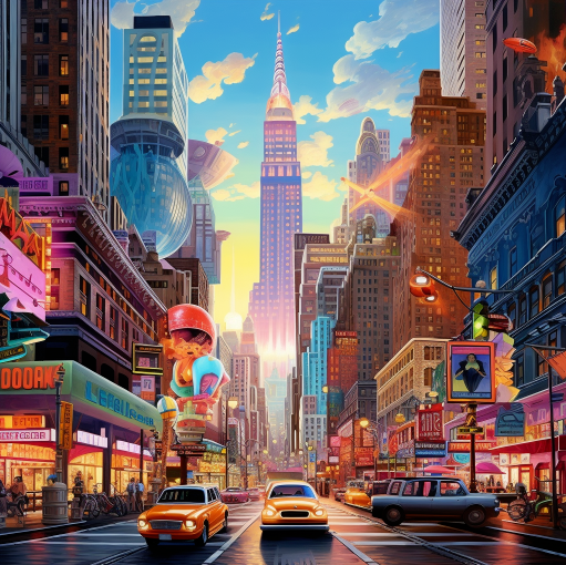 **Prompt:**A cityscape blending the architectural styles of the 1950s with futuristic elements. Flying cars zoom past towering skyscrapers with neon signs, while monorails weave between the buildings.