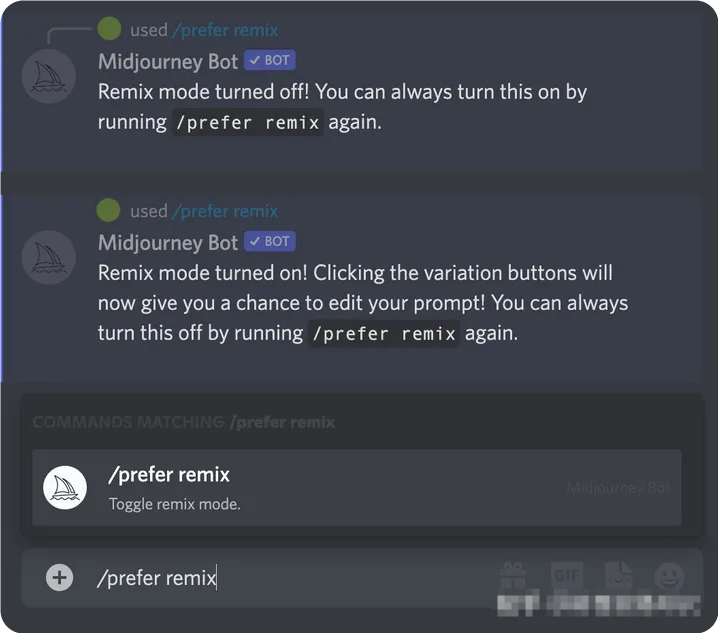 /prefer remix使用命令或使用/settings命令并切換按鈕激活混音模式 ? Remix Mode。