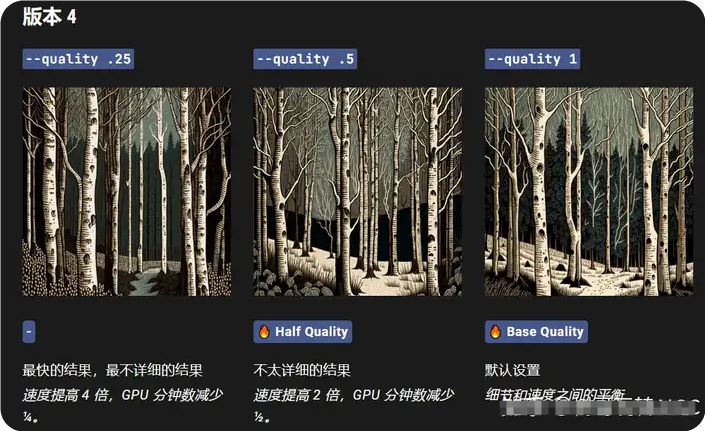 提示示例:/imagine prompt woodcut birch forest --q .25
