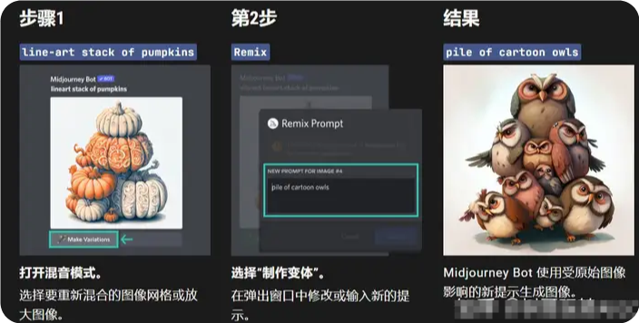 Remix 更改圖像網(wǎng)格下的變化按鈕(V1、V2、V3、V4)的行為。啟用 Remix 后,它允許您在每個變體期間編輯提示。要重新混合高檔選擇 Make Variations。