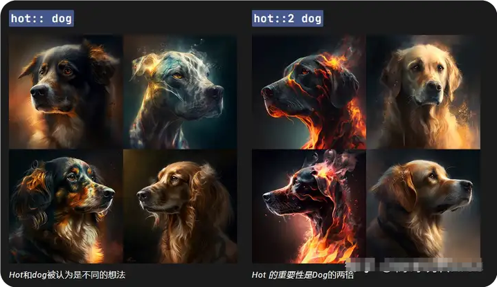 如果將提示分成兩部分,hot:: dog則將兩個概念分開考慮,從而創(chuàng)建溫暖的狗的圖片。