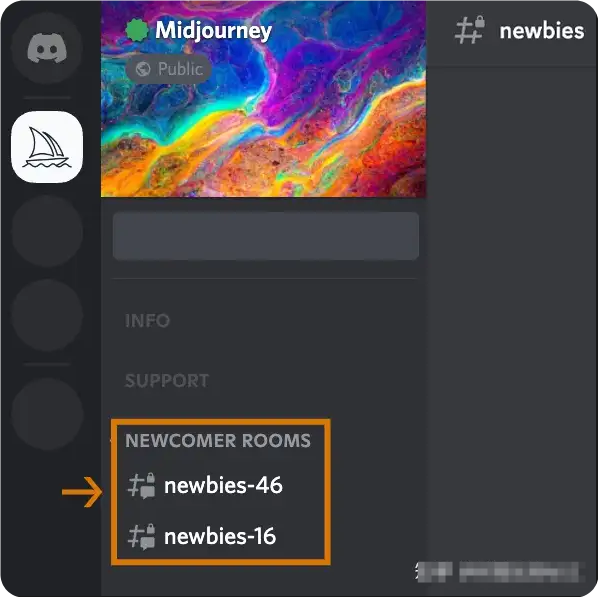 在midjourney官方服務(wù)器上,選擇newbies-#左側(cè)邊欄中可見的任何頻道。
