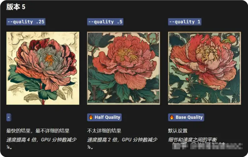 --quality <.25, .5, 1, or 2>,或--q <.25, .5, 1, or 2>您要花費(fèi)多少渲染質(zhì)量時間。默認(rèn)值為 1。值越高成本越高,值越低成本越低。