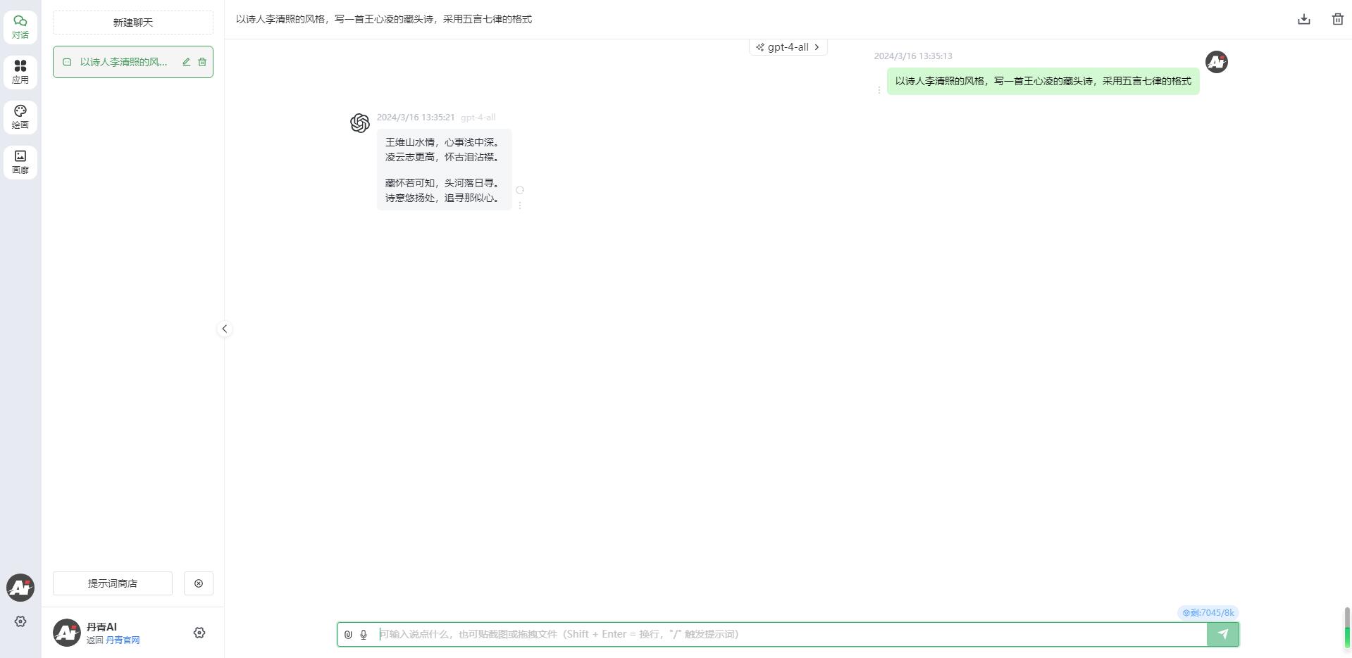 姓名藏頭詩(shī)免費(fèi)制作教程如上所示,如果你是要?jiǎng)?chuàng)作詩(shī)歌或者現(xiàn)代詩(shī)之類的文學(xué)創(chuàng)作,那么可以將這個(gè)AI對(duì)話模塊切換為詩(shī)歌生成器或者其它任意角色,都能像名字作詩(shī)在線生成器一樣實(shí)現(xiàn)你的需求。