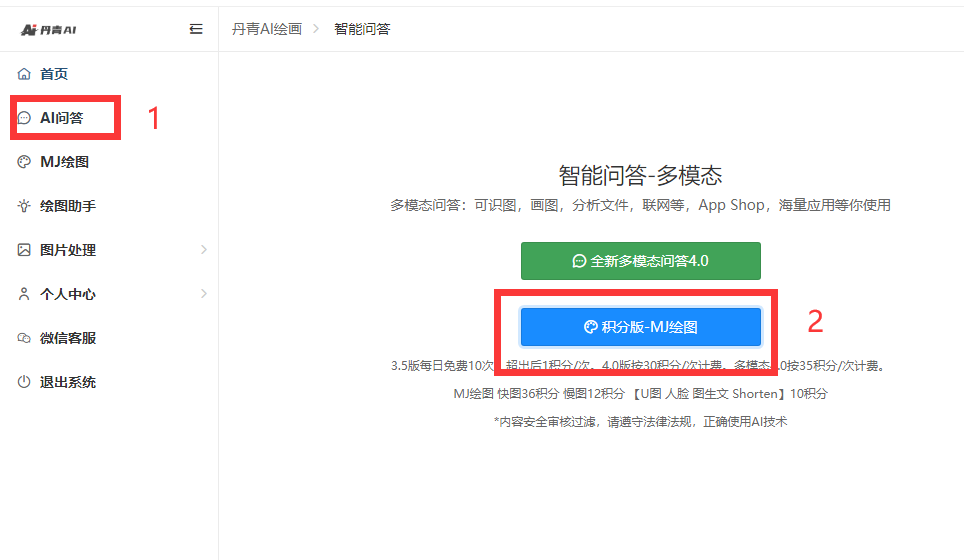 為了照顧新手朋友AI繪畫中不熟悉提示詞,這里建議大家按照下圖所示先點擊功能列表左側的“AI寫作”,然后在新頁面上點擊數(shù)字“2”所示的“積分版-MJ繪圖”;