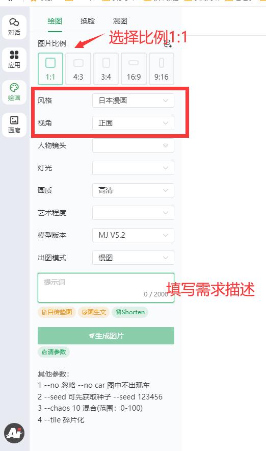 然后在新界面上大致安裝下圖所示選擇圖像比例和風格,其它選項的話可以根據(jù)自己的想法都去看看然后選擇一下即可,重點是后面的“提示詞”框內要重點描述好你想要的頭像生成的樣子,然后點擊“生成圖片”按鈕即可。