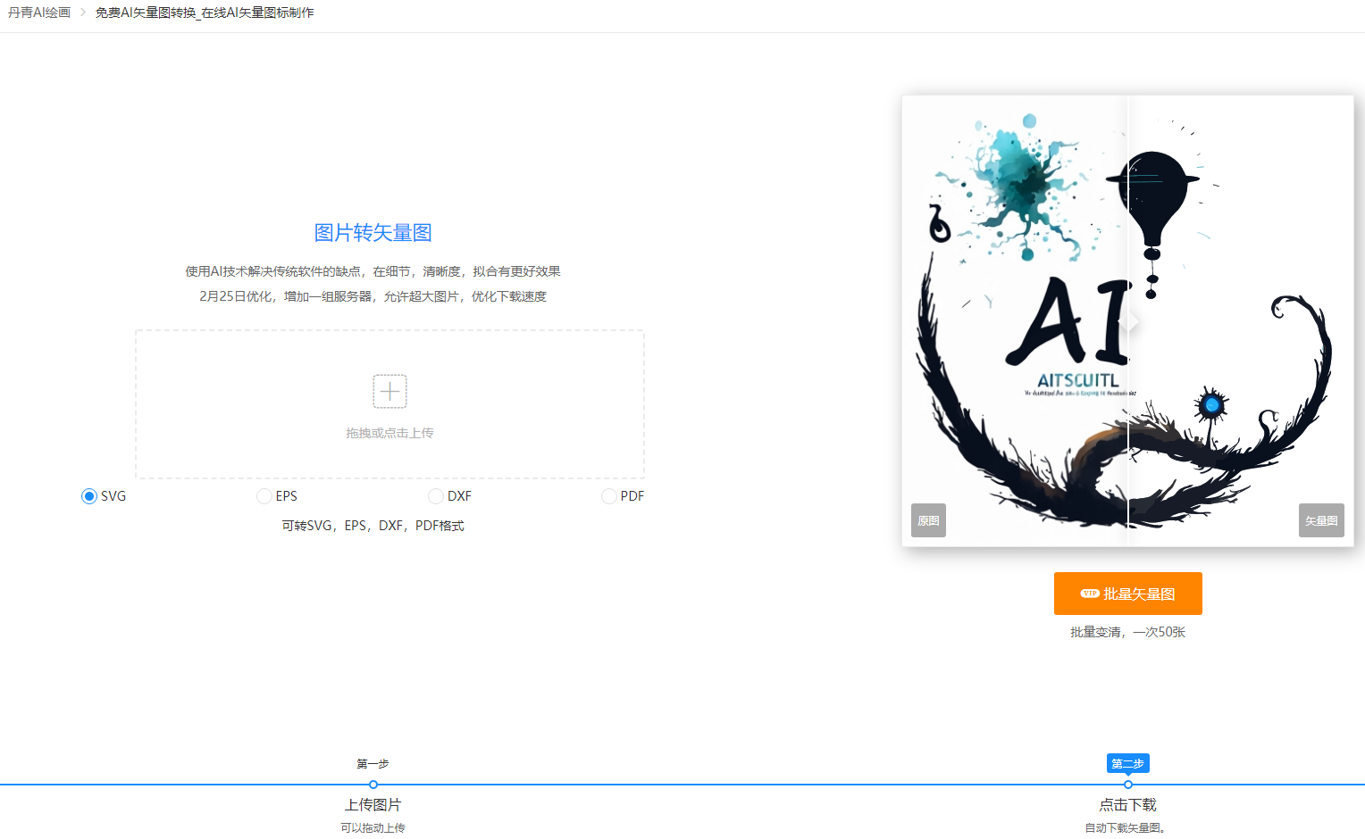 然后在左側(cè)上傳源文件圖片,我們的丹青ai矢量圖在線轉(zhuǎn)換工具就會(huì)自動(dòng)將上傳的圖片自動(dòng)轉(zhuǎn)換為svg格式的矢量圖,然后下載即可使用了。