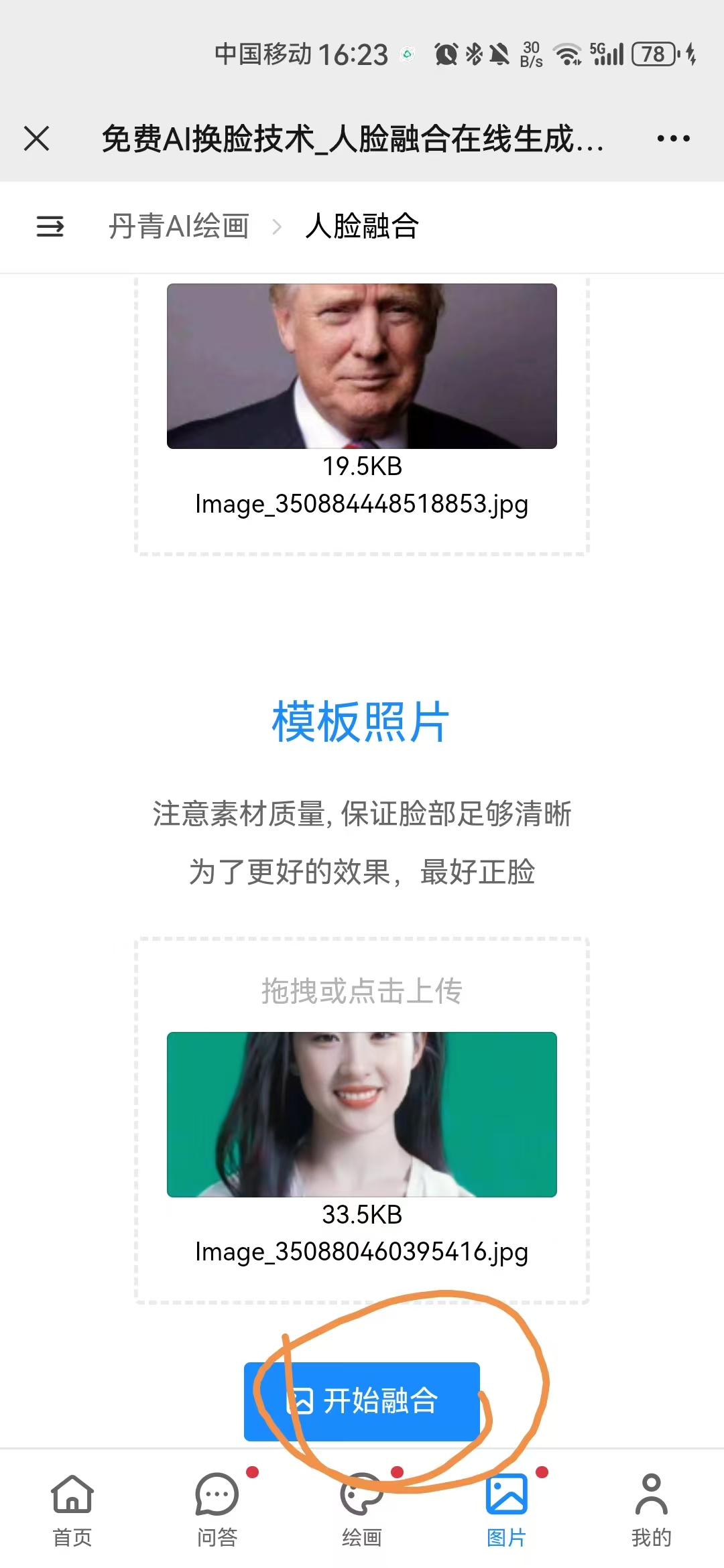 比如我們將川建國的頭像變成劉亦菲的樣子,那么我們就將川建國的頭像上傳然后再上傳劉亦菲的頭像,然后點(diǎn)擊“開始融合”進(jìn)行ai換臉。