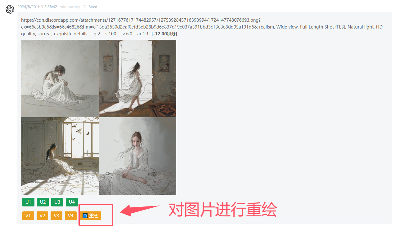 需要注意的是我們在使用積分版ai繪畫剛提交提示詞后生成的圖片后面也是有“重繪”的按鈕,這個是根據(jù)提示詞整體重新ai繪圖并不是midjourney局部重繪的,這個需要大家使用過程中注意的哈。
