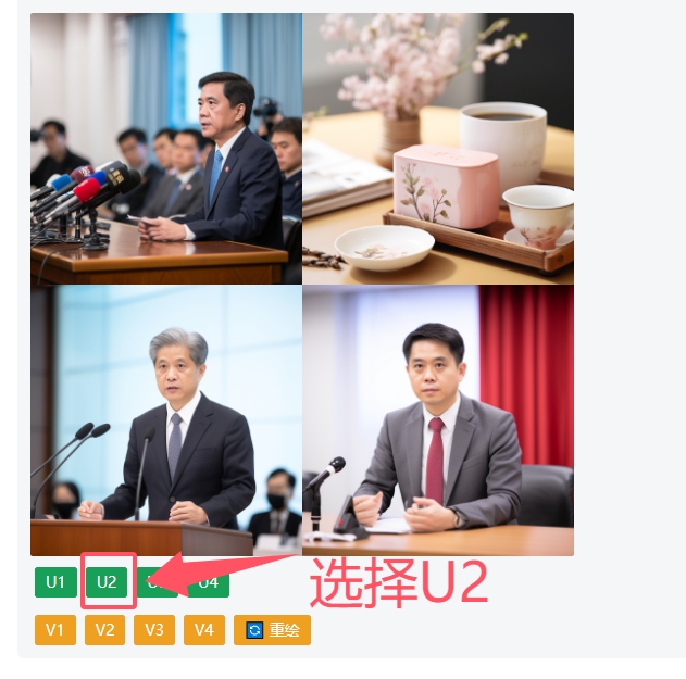 通過上面頁面提交提示詞后生成ai繪圖后,我們對生成的圖片進(jìn)行U圖,如下圖所示比如我們需要重繪圖2那么就選擇U2即可。