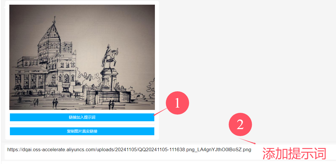 然后在圖片上傳后點(diǎn)擊“鏈接加入提示詞”,然后就會在輸入框?qū)肓藞D片地址如下圖標(biāo)注2所示,在圖片地址后面加上提示詞重新提交發(fā)送個(gè)midjunery即可完成圖生圖了。