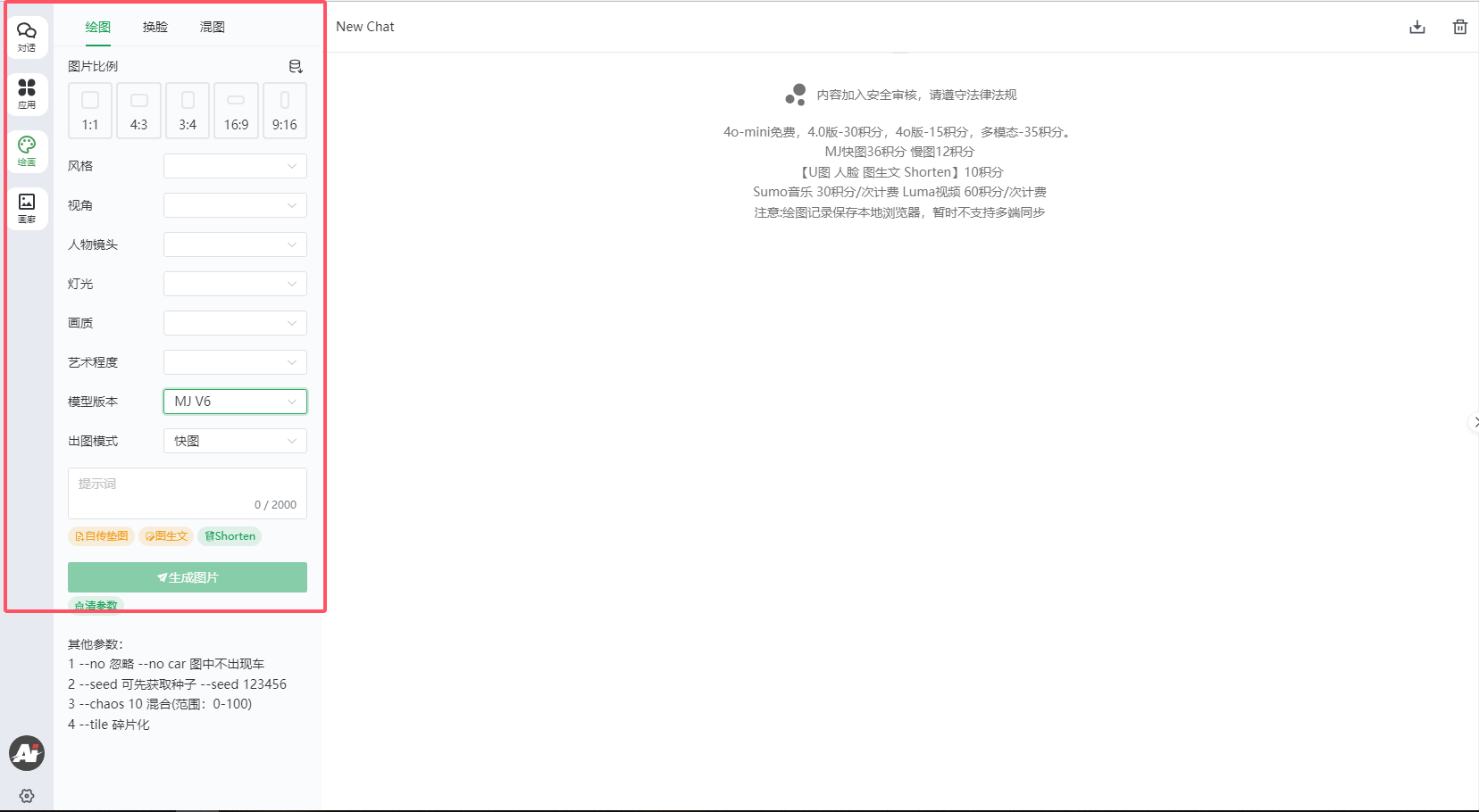 積分版MJ繪畫(新手版Midjunery)積分版midjunery繪畫界面則將各種設(shè)置產(chǎn)數(shù)的選項(xiàng)變成常規(guī)選項(xiàng),不需要在提示詞里面去進(jìn)行設(shè)置參數(shù),同時(shí)還支持局部重繪,原版midjunery繪畫的所有功能這里也都兼容進(jìn)來了,對于新手操作來說就更加方便了。