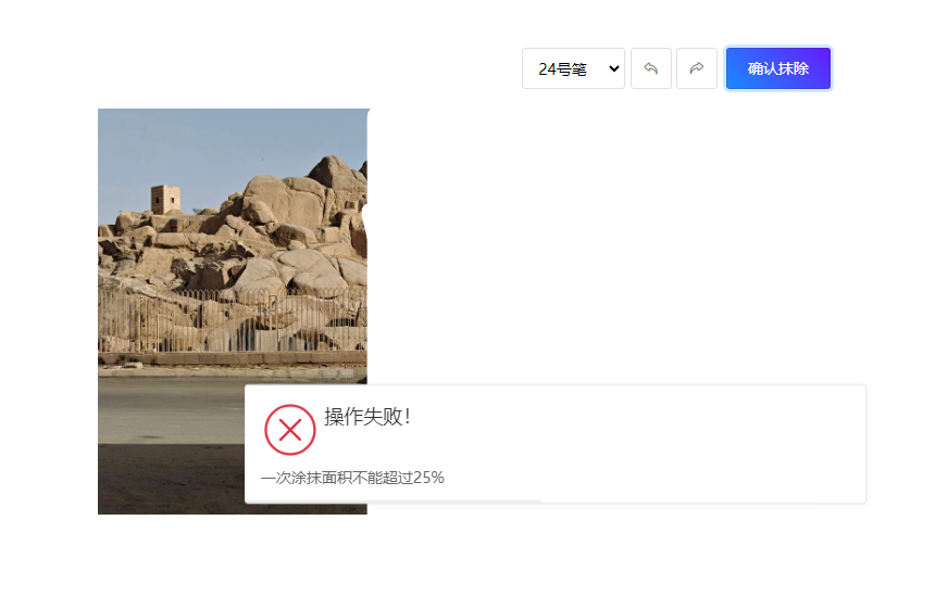 在使用ai消除圖片過程中需要注意的是單次涂抹的面積不能超過25%,不然的話就會提示操作錯誤,這個時候我們則需要返回重新標定合適的涂抹區(qū)域。