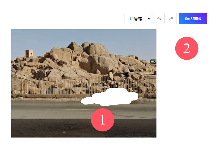通過畫筆我們開始對圖片中需要消除的內(nèi)容進行涂抹,為了使畫面更加和諧,涂抹的過程中需要將物體的影子部分也包含進去,這樣ai消除出來的圖片更加和諧自然。標定了ai消除的區(qū)域后我們即可如下圖2所示的點擊“確認抹除”的按鈕。涂抹過程中有誤差的步驟可以通過返回和繼續(xù)的按鈕進行上一步和下一步進行糾正。
