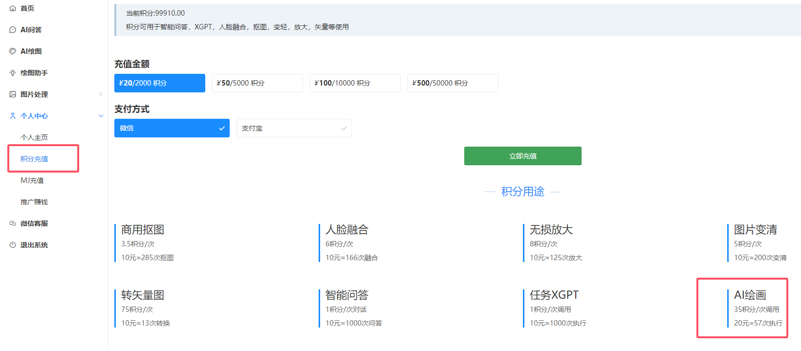 以上就是針對(duì)新手初學(xué)Midjourney繪畫的一鍵操作教程,重點(diǎn)強(qiáng)調(diào)一下積分版的ai繪畫充值是在和問(wèn)答一起的,如下圖所示的充值對(duì)應(yīng)的額度才能使用,否則充值到原版Midjourney繪畫操作界面是不通用的,這一點(diǎn)希望用戶朋友了解。