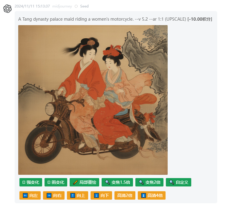 我們可以直接在輸入框“一個(gè)唐代宮女騎著一輛女裝摩托車”,點(diǎn)擊提交發(fā)送即可一鍵生成ai繪畫。針對(duì)初學(xué)新手用戶這里都是界面化的操作,可以根據(jù)自己的繪畫需求選擇一些產(chǎn)數(shù),都是很直觀的了。