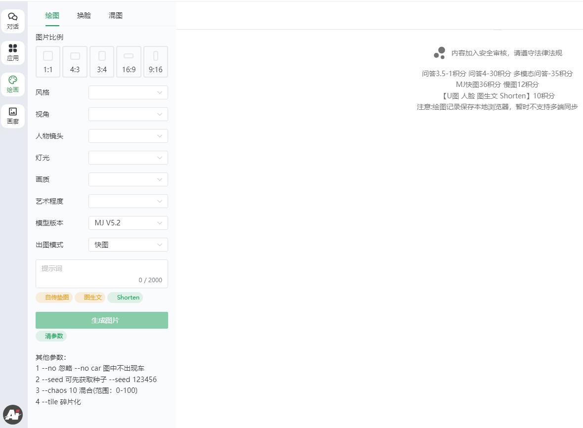然后我們可以在如下圖所示的功能界面上進(jìn)行AI美女寫(xiě)作作畫(huà),這個(gè)對(duì)新手朋友就比較友好,同樣都是原版MJ繪圖技術(shù),大家可以放心使用。
