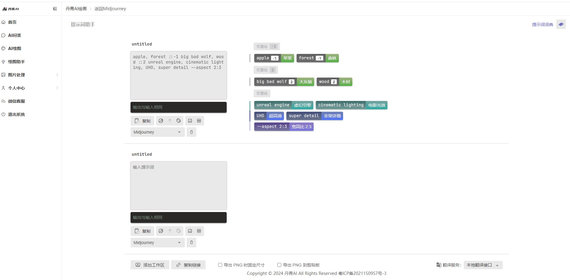 丹青ai繪圖助手特點(diǎn)1、純中文輸入自動(dòng)在線精準(zhǔn)轉(zhuǎn)換英文提示詞,更加符合midjourney官網(wǎng)的理解;