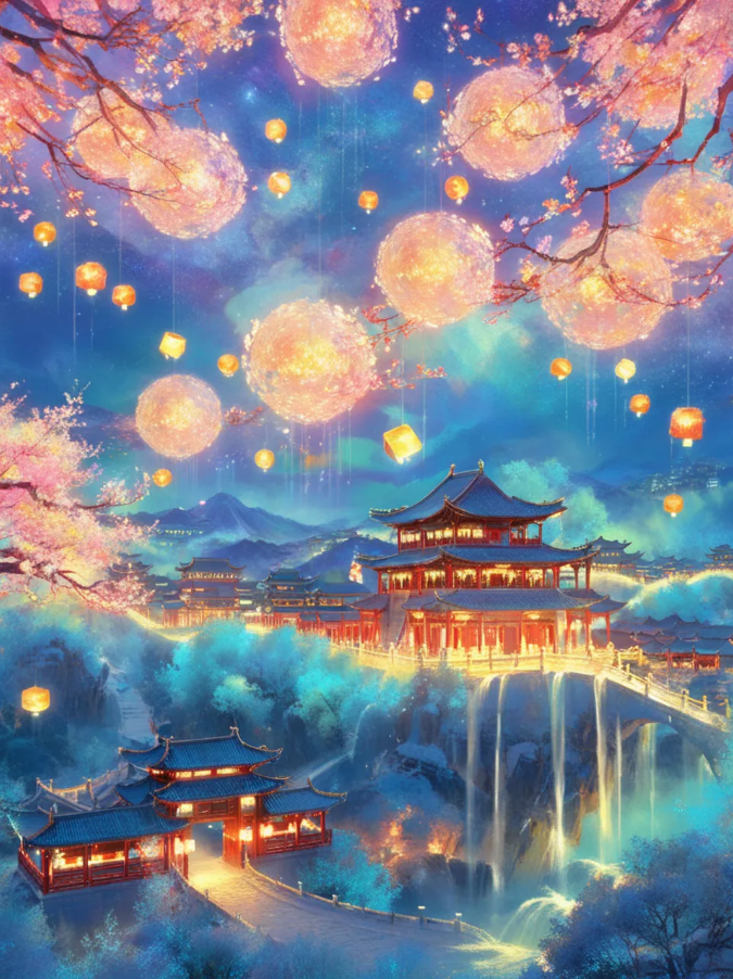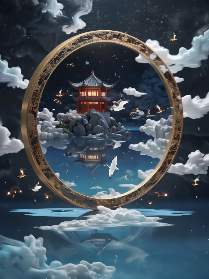 3.鏡中花園Fluid ink painting, three-dimensional ancient style, geometric meticulous brushwork, Chinese style light and shadow, shift axis photography, depth of field, dreamlike garden, strong visual impact, a large circular mirror placed in a classical garden, reflecting another world - stars dotted, Milky Way spanning, immortal cranes flying on the sea of clouds. Outside the mirror, a lantern gently sways, and the faint light echoes the stars in the mirror. Ultimate detail portrayal, realistic lighting, stunning light sensation, cinematic lighting effects, volume lighting, contour lighting, master's masterpiece, perfect composition,流體水墨,三維古風(fēng),幾何工筆,國風(fēng)光影,移軸攝影,景深,夢幻花園,強(qiáng)烈的視覺沖擊力,一面圓形的大鏡子,置于古典園林之中,鏡中映射出的是另一個世界——繁星點點,銀河橫跨,仙鶴飛翔于云海之上。鏡外,一盞燈籠輕輕搖晃,微弱的燈光與鏡中星辰遙相呼應(yīng)。極致的細(xì)節(jié)刻畫,真實光照,絕美的光感,電影光效,體積光,輪廓光,大師杰作,完美構(gòu)圖