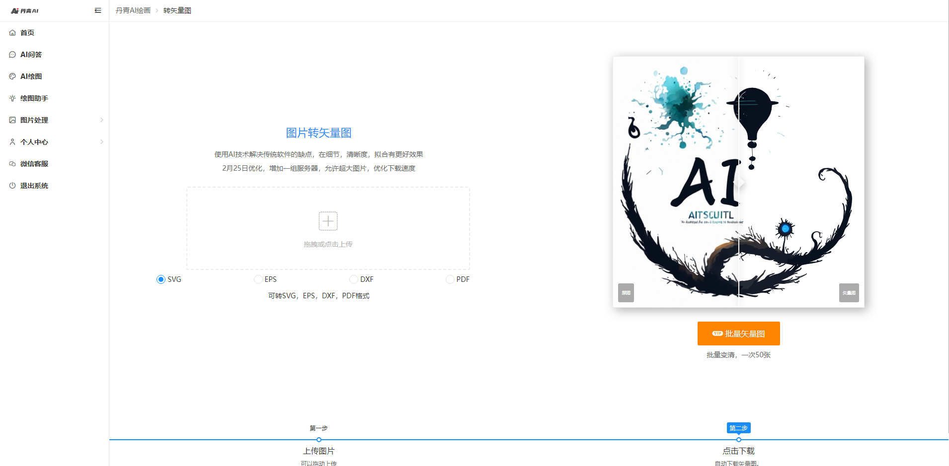只需要在我們丹青ai矢量圖轉換工具頁面上傳你的素材圖片,即可直接自動轉換為可轉SVG,EPS,DXF,PDF格式的文件,需要注意的是上傳處理過程中不要離開當前頁面,尤其是批量處理中很多用戶關閉或者刷新了此頁面導致生成轉換的文件沒有下載入口,因為我們?yōu)榱擞脩舻臄?shù)據(jù)安全是不做任何保存的,所以上傳以及生成的過程中必須在當前頁面完成后下載到文件再關閉,否則會扣除了相應的積分而又無法下載文件,這個希望用戶使用的過程中知悉。